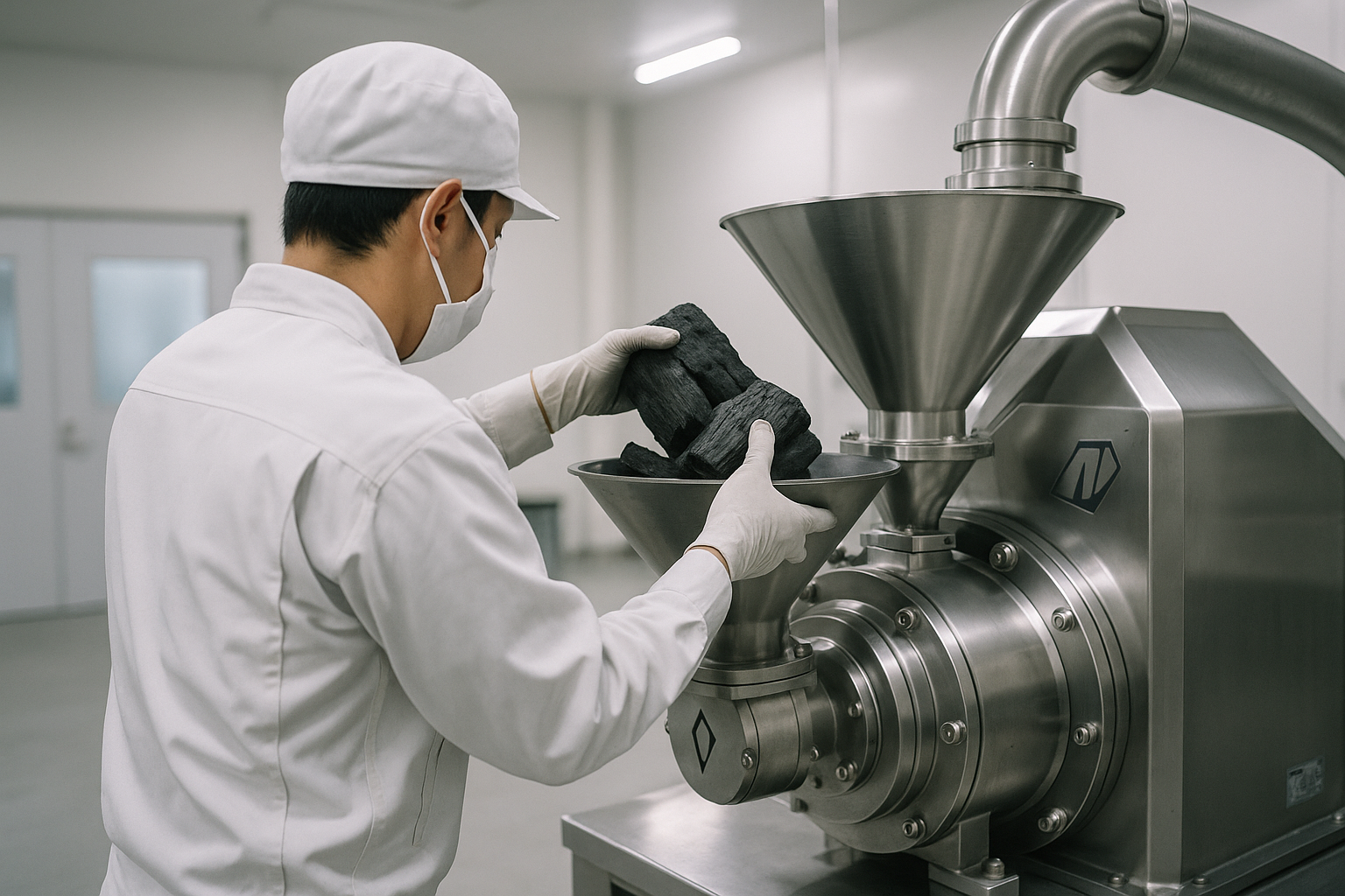 焼きあがった竹炭を、用途に合わせた粒度まで微粉末化します。